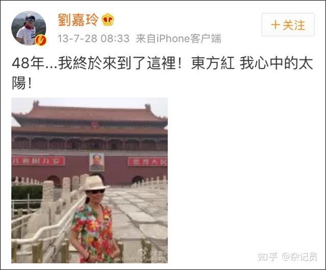 2013年,刘嘉玲在微博上传一张在天安门前拍下的照片,配以图说:“东方红,我心中的太阳!”
